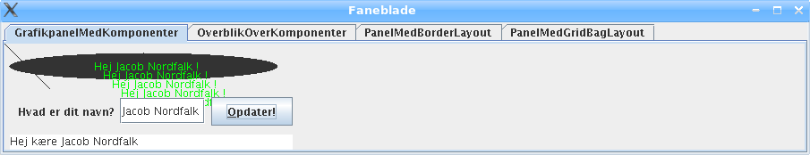 Her har vi tastet "Jacob Nordfalk" ind og trykket på "opdater!"-knappen (paintComponent() er ændret til også at tegne navnet 5 gange).