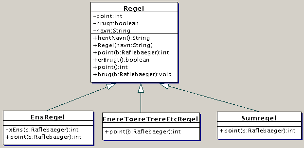 Vi skal lave et Yatzy-spil for flere spillere. Der kan være et variabelt antal spillere, hvoraf nogle kan være styret af computeren. Computerspillerne skal have forskellige strategier (dum/tilfældig, grådig, strategisk), der vælges tilfældigt.