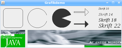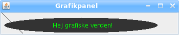 }For at følge med i hvornår der bliver tegnet skriver vi Der blev tegnet!! ud når metoden bliver kaldt. For at se grafikken skal vi definere en main()-metode, der opretter et Grafikpanel-objekt og et vindue (JFrame), som viser panelet på skærmen: