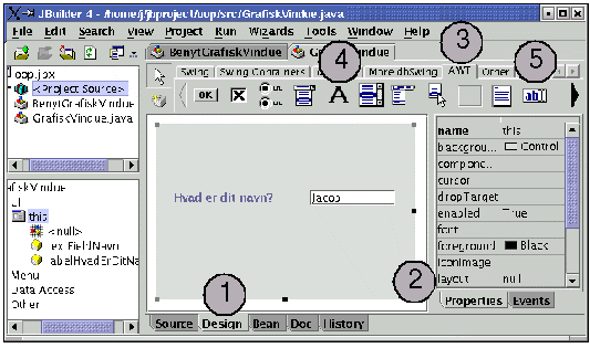 "Design"- og "Source"-fanen er to måder at se programmet på, og man kan frit skifte mellem dem. Laver man en designændring, vil det blive afspejlet i koden i jbInit(). Ændrer man i koden, vil designet ændre sig. I Forte/Netbeans er koden beskyttet mod ændringer). Tilføjer du din egen kode til denne metode, så sørg for, at det ligner værktøjets egen kode, ellers kan værktøjet have svært ved at opretholde sammenhængen mellem kode og design.