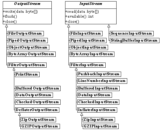 Af klassediagrammet ses, at metoderne i InputStream og OutputStream læser og skriver byte-data: write(byte[]) på OutputStream skriver et array (en række) af byte. Arvingerne har lignende metoder (disse er ikke vist).