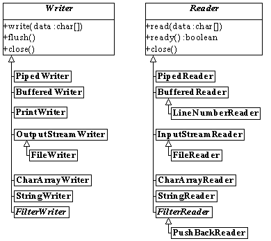 Af klassediagrammet ses, at alle metoderne i Reader og Writer læser og skriver tegndata (datatype char). Tegn repræsenteres i Java som 16-bit unikode-værdier, og man kan derfor arbejde med ikke blot det vesteuropæiske tegnsæt, men også det østeuropæiske, kinesiske, russiske, ...