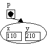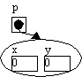 Point p;Ligesom med de simple typer skriver man typen (Point) efterfulgt af variabelnavnet. Nu har vi defineret, at p er en variabel til objekter af typen Point, og vi kan lave et nyt Point-objekt, som vi sætter p til at pege på1: