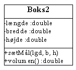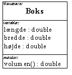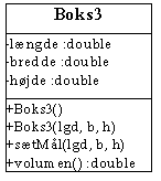 Vi definerer klassen Boks, som indeholder tre variabler, nemlig bredde, højde og længde. Derudover definerer vi metoden volumen(), som arbejder på disse data. Metoden returnerer en double og har ingen parametre.