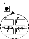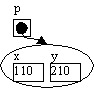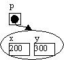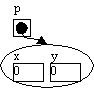 I dette tilfælde vil punktet starte med at have koordinaterne (0,0) og situationen er, som vist på figuren til højre: p peger hen på et objekt, der har en x- og y-variabel, som begge er sat til 0.
