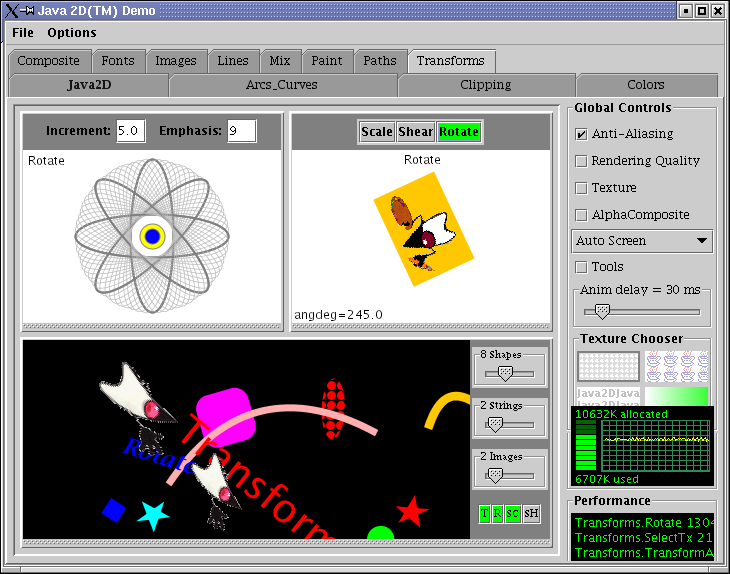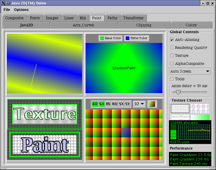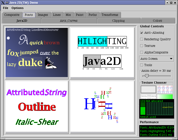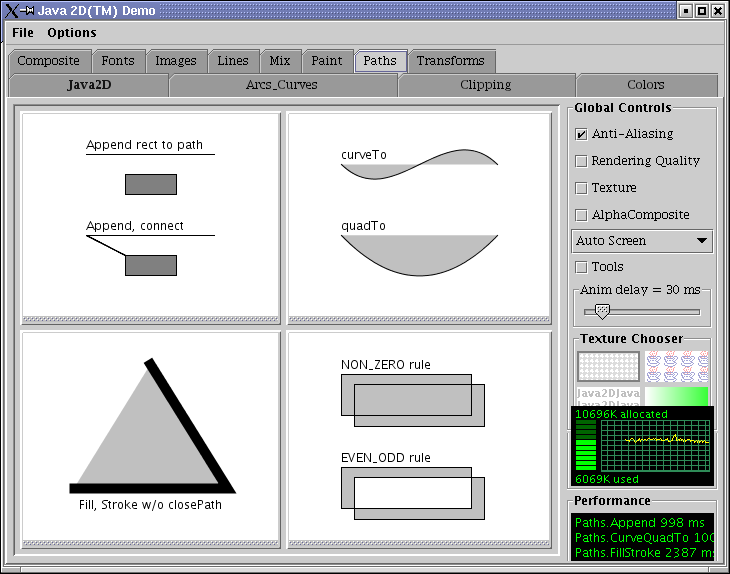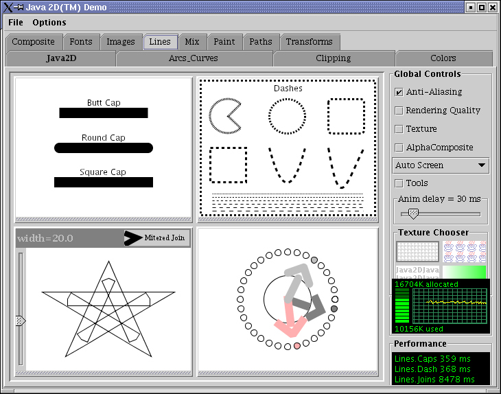 Sammen med Java følger et program, der illustrerer de fleste af mulighederne med Java2D. Det ligger i jdk1.4/demo/jfc/Java2D/Java2Demo.jar og startes ved at dobbeltklikke på jar-filen eller fra kommandolinjen skrive: java -jar Java2Demo.jar. Her ses nogle skærmbilleder: